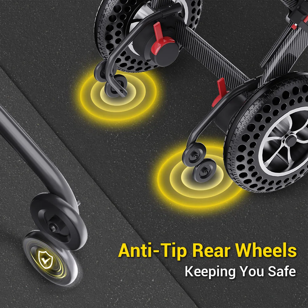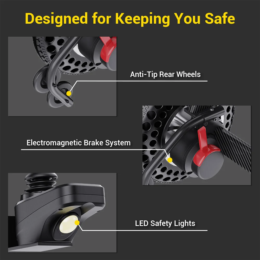 - Comfort-First Design: The shock-absorbing suspension system in both the seat and front wheels ensure superior comfort and support, even on bumpy surfaces.